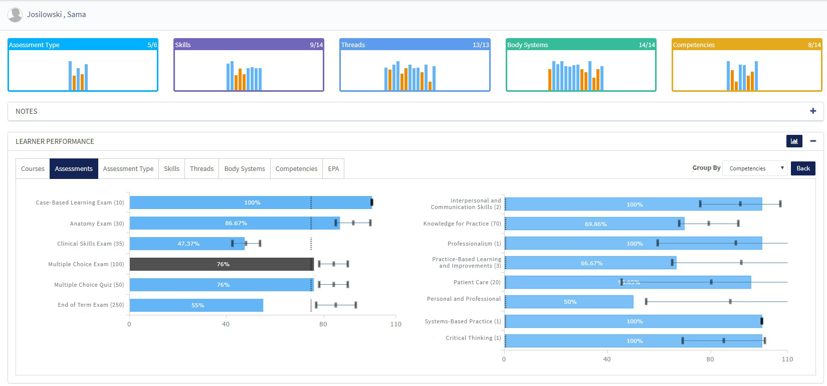 Track longitudinal views of competencies, EPAs, body and organ systems, diseases, skills, threads, and other curricular categories over the course of time.
